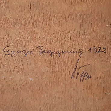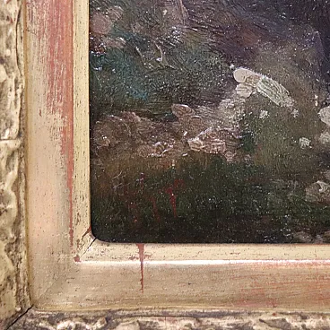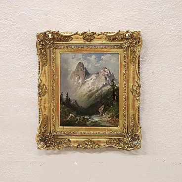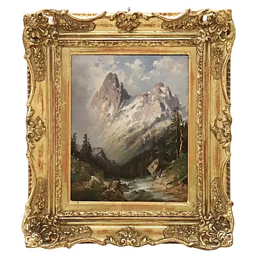 This small painting captures the charm of the mountains with their wild nature. In the foreground, a rushing stream flows through a wooded valley, while majestic mountains rise in the background. The greenery and sparse snow on the rocks suggest that the landscape was painted during the summer or spring. We can assume that this is an Alpine landscape from the Austrian region. The painting stands out for its evident pictorial quality and highly personal style, with material brushstrokes. The colors perfectly capture the light and atmosphere of the mountains. The landscape is rendered with realism; note the attention to detail in the clouds that envelop the mountain tops on the left! The painter focuses on the fantastic grandeur of nature. If you love the mountains, this painting will win you over, so much so that it will make you feel transported by the scents and sounds of nature. A wonderful painting that will enchant your guests!