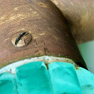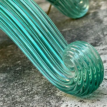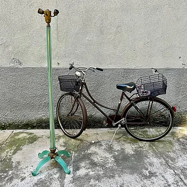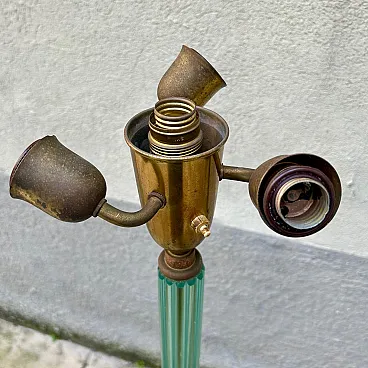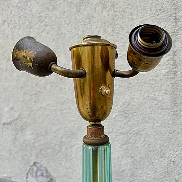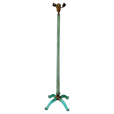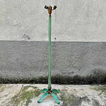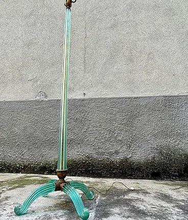 Murano glass floor lamp attributable to Barovier & Toso, made in Italy between the years ’30 and ’40. An elegant example belonging to the refined Murano production of the period, characterised by a structure entirely made of blown and hot-molded glass. The central shaft, made of aqua green glass, features a vertical grooved rigadin work, typical of the Venetian tradition, which gives optical depth and a vibrant interaction with light. The base is composed of four curved glass arched elements, configured in a multiple structure with a strong sculptural impact, less common than the more widespread tripod versions documented on the market. The whole expresses the formal language of transition between late Deco and early Italian modernism. A less common structural configuration, which distinguishes this specimen from the more widespread tripod versions on the market. The structure is completed by brass elements with a coherent patina, which integrate and support the whole with balance. Particularly relevant is the presence of incussed numbering on the metal elements, an indicator of organized production and an original modular assembly system. The base features an articulated construction with separable elements (3+1 configuration), designed to facilitate assembly and maintenance, a feature found in high-level Murano productions of the period. Due to its typological characteristics, performance quality and comparison with specimens documented on the international market, the lamp is attributable to Barovier & Toso.