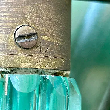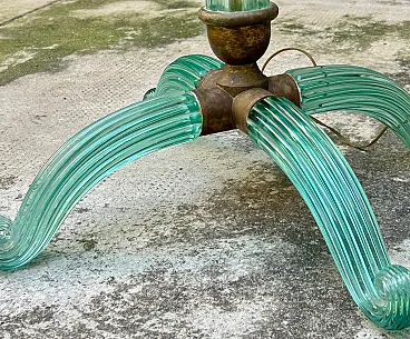 Similar specimens, generally in tripod configuration and in amber hues, are known from specialized galleries, confirming their belonging to a coherent production line. Teal glass is a less common variation than more popular versions, contributing to greater visual freshness and versatility in contemporary contexts. Brass with original patina. Glass in excellent condition, with no noticeable breakage. Overhauled electrical system. A highly scenic example, ideal for sophisticated interiors, interior design projects, or collections dedicated to early twentieth-century Murano glass.