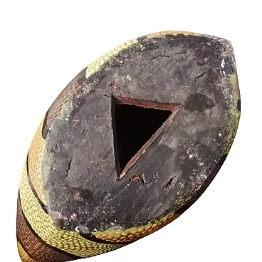 Vaso in terracotta realizzato a mano, caratterizzato da una decorazione che richiama lo stile aborigeno. Questi pezzi sono spesso prodotti artigianalmente sull'isola di Bali, in Indonesia, dove le donne preparano l'argilla mescolandola con sabbia, acqua e oli.