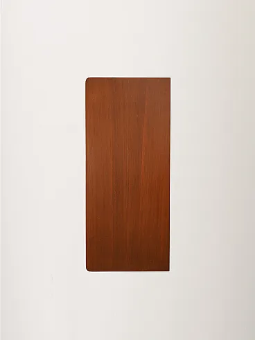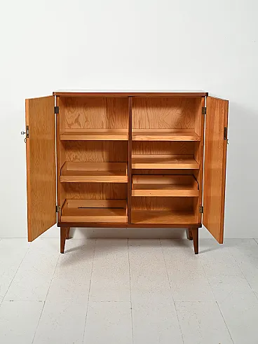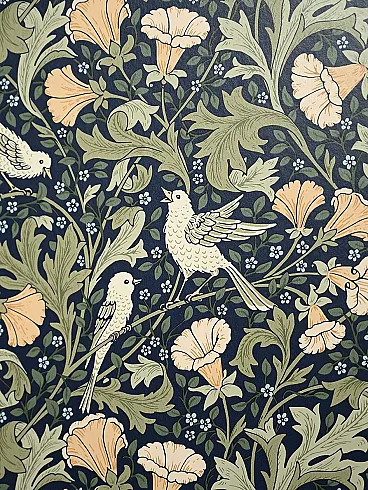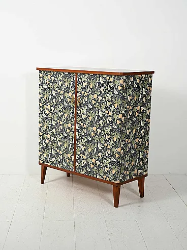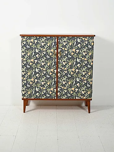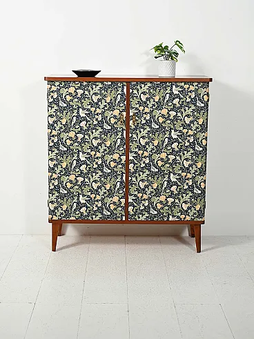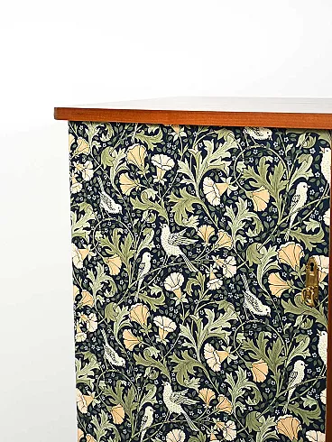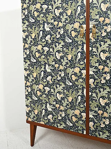 Scandinavian cabinet from the 1950s with a linear wooden structure and doors covered in wallpaper inspired by William Morris motifs, rich in floral weaves and bird figures on an intense blue background. Nordic rigor merges with Arts and Crafts aesthetics, creating a cultured and decorative contrast. Brass handles and nozzles enhance the period character, while the slender legs lighten the composition.