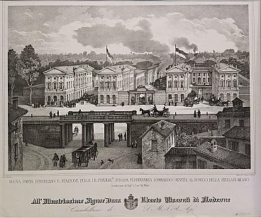 Giuseppe Elena (Codogno 1801 - Milan 1867) was an Italian engraver who achieved a prominent place in the history of lithography in Milan. Abandoned the seminary studies entered the Academy of Fine Arts of Brera where he distinguished himself as a miniaturist and in 1826 he won the competition of the second class of figure for the invention of the drawing. Opened, from 1827 until 1831, in his home a lithographic print shop in order to specialize in this figurative field and once ceased the activity between 1835 and 1845, will devote himself to his lithographs that develop themes on city life or views of gender. Arrigoni (1974) lists in the catalog about 350 lithographs, and such a production makes the artist a chronicler of the life and environment of Lombardy and Milan at the time. In this lithograph drawn by Giuseppe Elena is represented the project of the Engineer in Chief Mr. Milani, never realized, for the new entrance door and station of Milan. The sheet, curious testimony of how it could have been a part of the city, in particular the Borgo della Stella, was printed at the lithographic establishment Saturnino Brison (1791 - 1848) and Corbetta Francesco (1815 -). In the foreground we see minutely described through games and chiaroscuro contrasts a group of houses with crumbling walls, in the middle an omnibus, dogs and people walking. In the background, an open carriage travels along a raised road. Beyond the buildings, the station is dazzled by the sun, flags stand out over the central buildings, wagons and people crowd the adjacent spaces, and in the distance, amidst rich vegetation, a running train with steam smoke rising toward the sky. At the bottom beyond the image title and dedication to Duke Uberto Visconti di Modrone Chamberlain of His Majesty Imperial Regia Ap. Another example is kept in Milan, Civiche Raccolte Grafiche e Fotografiche. Civic Collection of Prints Achille Bertarelli Bibliography: P.Arrigoni (edited by) Milano nelle vecchie stampe, 1969, n.779, pag.148.