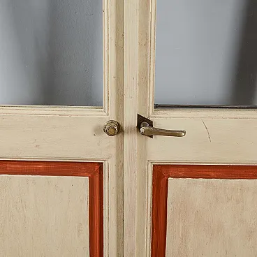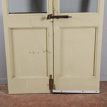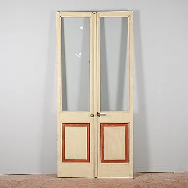 This elegant double-door with glass represents a refined example of period craftsmanship, ideal for those who want to infuse a touch of authenticity and historical charm into their rooms. Crafted with a solid structure, this antique piece stands out for its balanced proportions and classic style, perfect both as a functional separating element and as a sought-after vintage furnishing detail. The doors feature large glass surfaces that encourage the passage of light, framed by a wooden frame with a warm natural hue. The construction details, such as the original hinges and the processing of the profiles, testify to the typical quality of the production of the past. It is an ideal solution to enhance an entrance hall or elegantly divide two living areas, ensuring brightness and a visual impact of great aesthetic value for every private collection or interior design project.