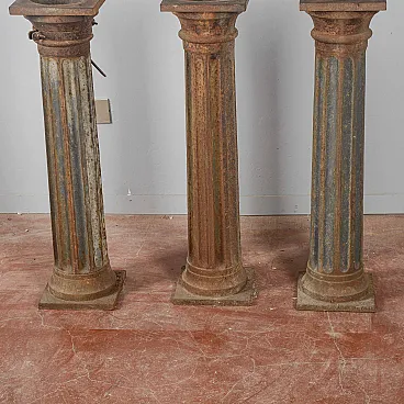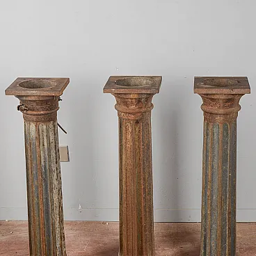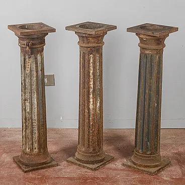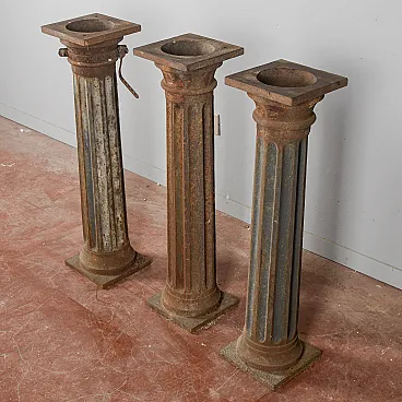 These cast iron columns represent an authentic example of period industrial architecture, ideal for those seeking decorative elements with a strong character. These columns evoke the aesthetics of the early twentieth century, becoming today sought-after pieces of architectural modernism suitable for both interiors and exteriors. Each element has a grooved shaft that ends with a quadrangular base and capital. The surface shows a natural oxidized patina that accentuates its vintage charm. Cast iron, a material known for its strength, makes these pieces perfect as pedestals for sculptures or plants. Some examples retain original details, such as fastening collars, which increase their collectible value. Perfect for defining the space in a loft or for enriching a garden, these columns enhance each room with elegance and solidity.