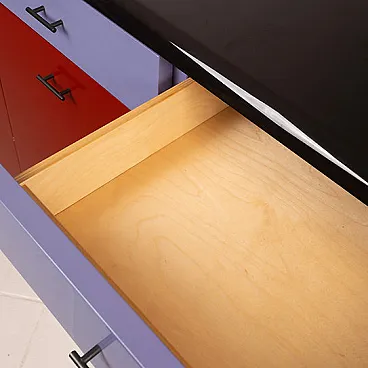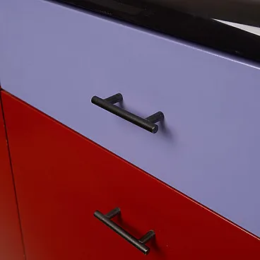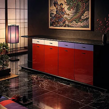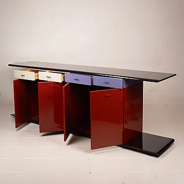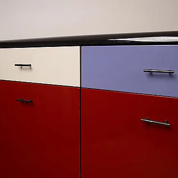 The structure consists of a modular system of drawers and storage compartments that are fully repositionable, allowing them to be freely moved and reconfigured according to the user’s needs, transforming the sideboard into a dynamic rather than static element. The chromatic interplay, typical of the 1980s, alternates lacquered surfaces in shades of red, white and blue/lilac, creating a bold and highly recognizable graphic effect.
