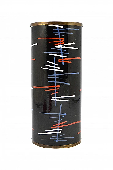 Enameled metal umbrella stand with brass edges, produced by S.I.V.A. of Poggibonsi at the turn of the 1950s and early 1960s. S.I.V.A., a factory of art enamels on steel, was founded in 1953 by the painter and sculptor Giuseppe Calonaci, with the intention of spreading art in society through the creation of furnishing accessories. Here he works together with many contemporary artists including Silvano Bozzolini, Pirro Cuniberti, Gualtiero Nativi, Marta Pieraccini, Concetto Pozzati, Giovanni Korompay, and many others. In excellent condition, perfect enameling, brass edges in patina, polishable upon customer request. One dent on the bottom edge.