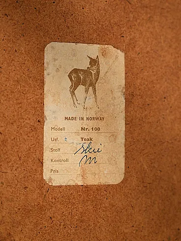 The seat features a padded cushion covered in cream-colored leather. The object retains the original production label “Made in Norway – Modell Nr. 100”. Good condition. It may show some signs of aging. Please pay attention to the photographs.