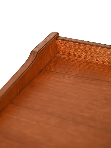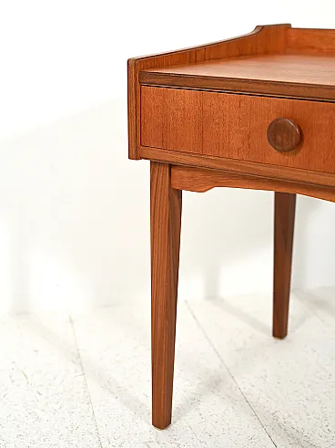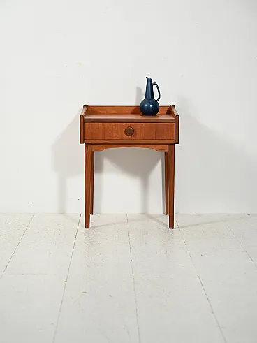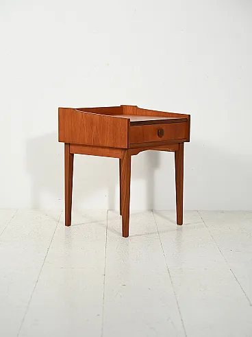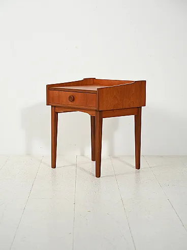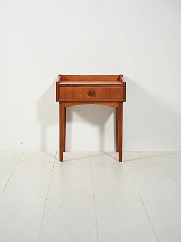 Scandinavian bedside table from the 1950s made of teak, characterized by compact proportions and a refined design that reflects the language of post-war Nordic modernism. The structure is defined by slightly raised and shaped edges, which frame the upper surface creating a soft and continuous profile. The cabinet features a front drawer with a round handle carved in wood. The whole gives a compact object but full of character, in which the quality of the teak, the clean lines and the balanced proportions fully express the functional and sober aesthetics typical of Nordic furnishings of the 1950s.