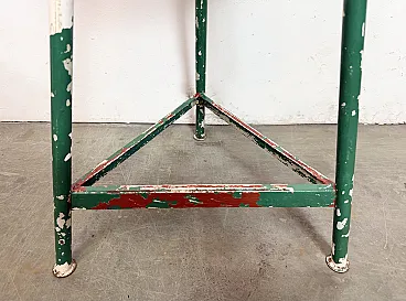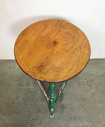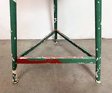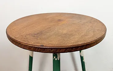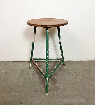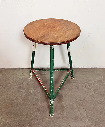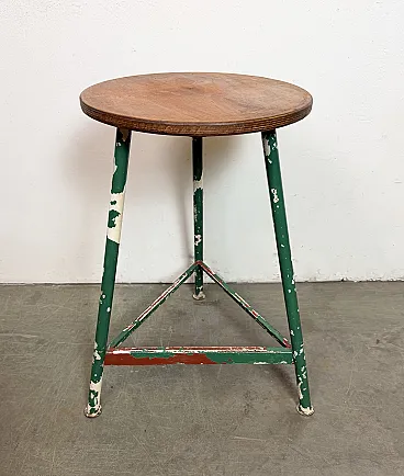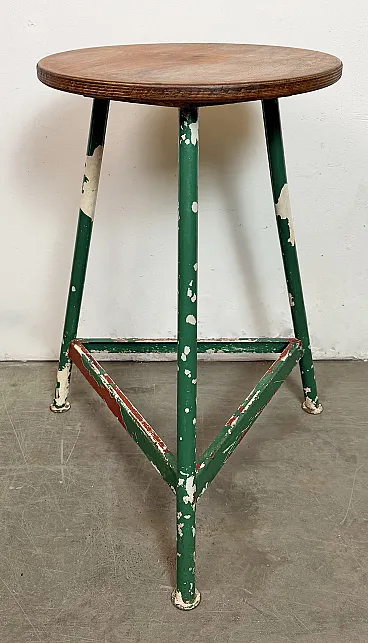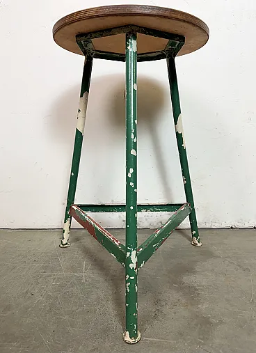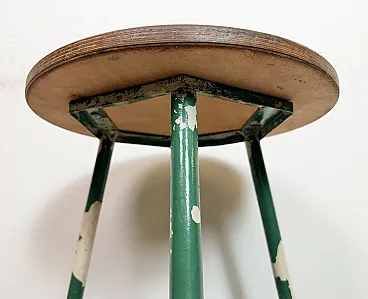 Vintage Industrial factory stool made in former Czechoslovakia during the 1960s It features a plywood seat and a green metal frame. The weight of the stool is 3,5 kg. The diameter of the seat is 36 cm.