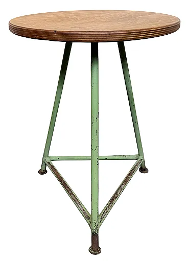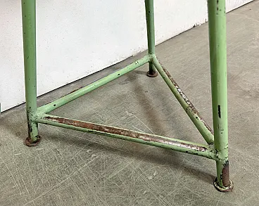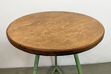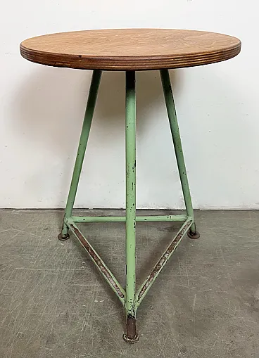 Vintage Industrial factory stool made in former Czechoslovakia during the 1960s It features a plywood seat and a green metal frame. The weight of the stool is 4,6 kg. The diameter of the seat is 35 cm.