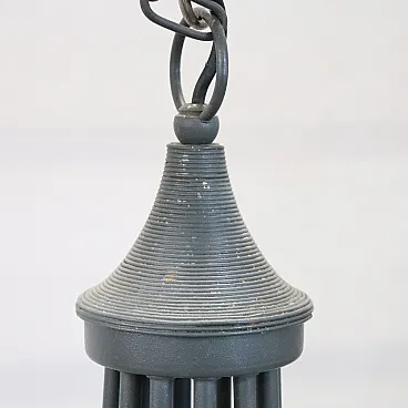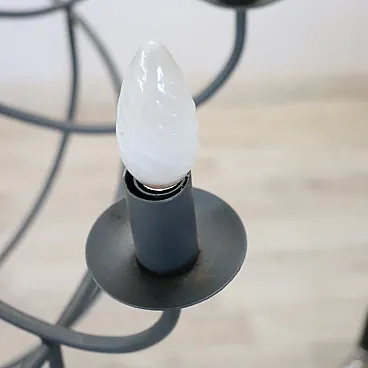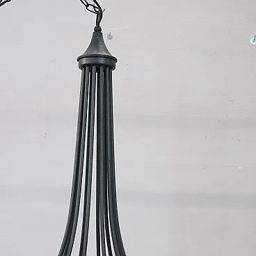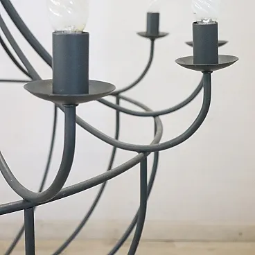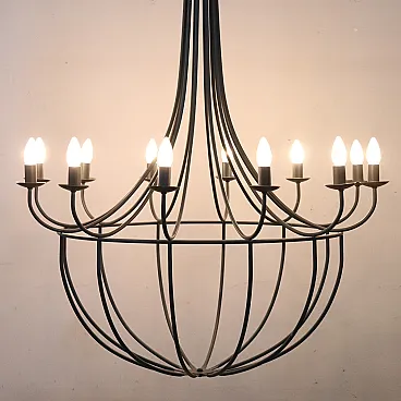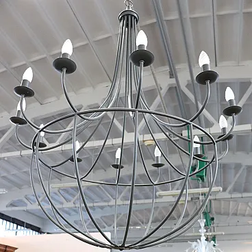We present this unique and majestic black iron chandelier, dating back to the second half of the 20th century (around the 1980s), a piece of great visual impact thanks to its imposing dimensions. Its distinctive design evokes a sense of timeless elegance, combined with a modern minimalist style. The chandelier has the characteristic shape of a balloon, or hot air balloon (as it is called in Italy), from which twelve arms branch out, each designed to house a light bulb, creating a balanced and symmetrical appearance that enhances its decorative value.