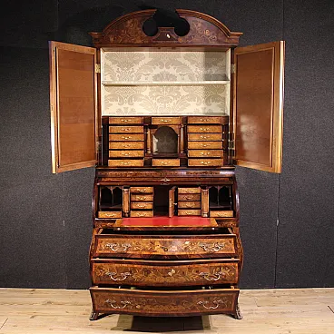 Dutch trumeau from the second half of the 20th century. Furniture wavy on the front and straight on the sides of excellent quality, richly inlaid in walnut, briar, bois de rose, maple, mahogany and fruit wood with floral decorations and butterflies. Double-body trumeau which has three spacious drawers in the lower part, an extractable desk top and, inside the roller flap, numerous small drawers and document compartments (see photo).