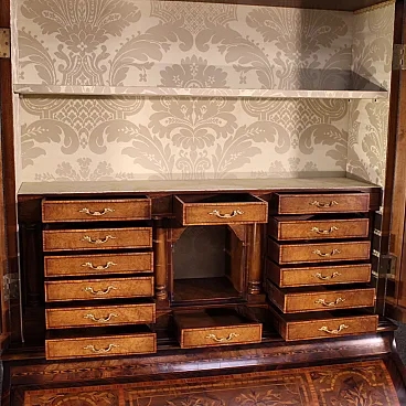 Upper body doors with recessed beveled and antiqued glass. Very useful and capacious interior, covered in damask fabric and also complete with numerous secret drawers and columns for documents (see photo). Ideal piece of furniture to place in a living room or study, with fabulous furnishings and strong impact, for antique dealers and interior designers. Complete with three working keys (upper doors, roller flap and internal door), furniture which is overall in a good state of conservation.