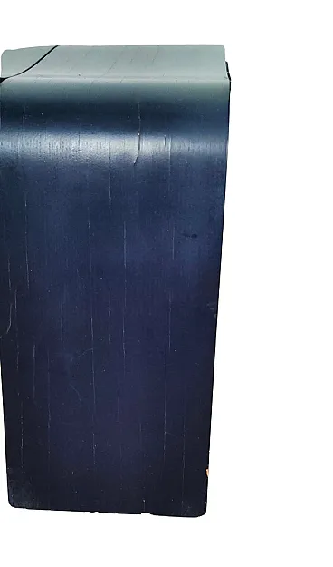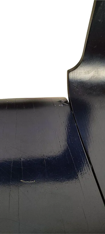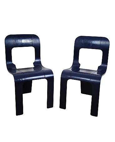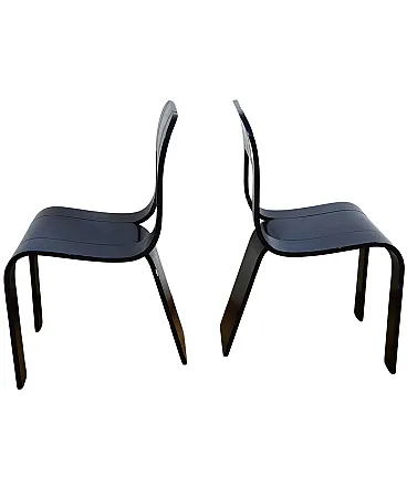The set of two "Esse" dining chairs was designed by Italian designer Gigi Sabadin for Stilwood in 1973. These chairs are made of bent plywood with a midnight blue painted ash finish. The organic design gives the impression of being carved from a single piece of wood, cut and bent. Supported by three legs, it forms a floating shape that serves as both a seat and a backrest. They are stackable and therefore easy to store when not in use. Despite their age, these chairs are in good condition, with some signs of wear.