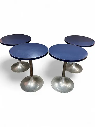 Set of four elegant Tulip coffee tables with a 3cm thick round top. 59cm blue lacquered. in diameter.