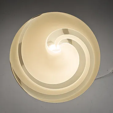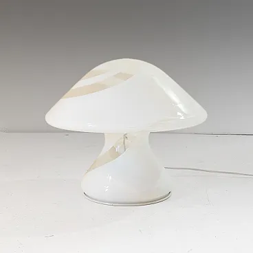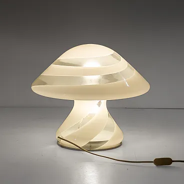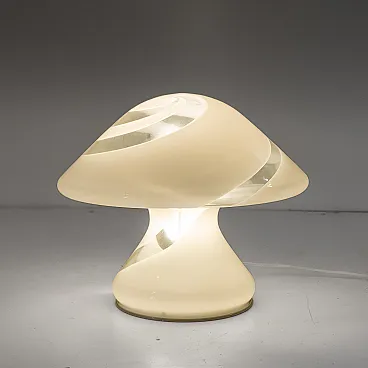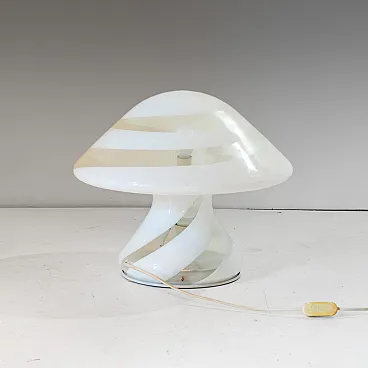 The lamp is made of a single piece of Murano glass, without joints, with the sophisticated "spiral" technique. Translucent, milky-white spiral stripes elegantly wrap around the organic, mushroom-shaped silhouette, creating a hypnotic visual rhythm.