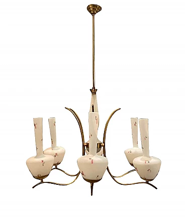 Stilnovo Opaline Glass Brass Chandelier, Opaline glass shades with multicolored designs. Brass Frame. New wiring installed, features 6 lights, requires E14 light bulbs. New wiring installed compatible with UK Europe USA. SHIPPING IN A WOODEN CRATE FOR SAFE ARRIVAL.
