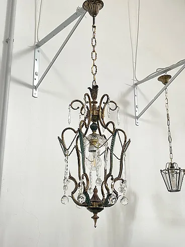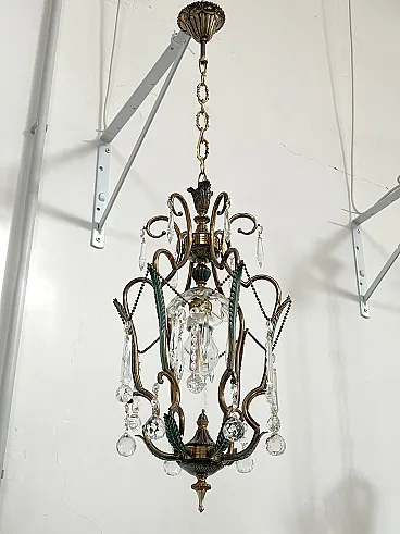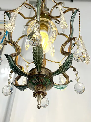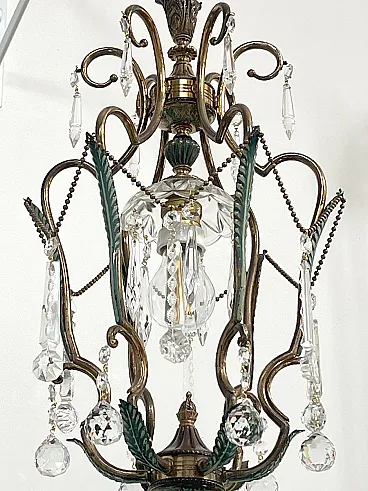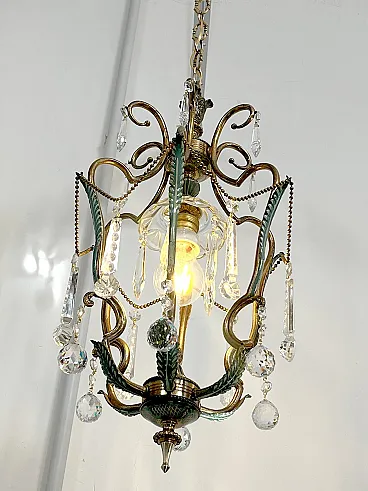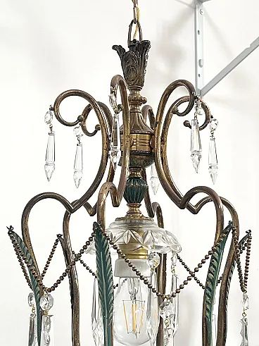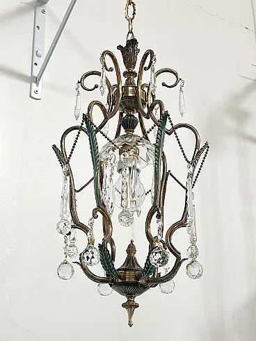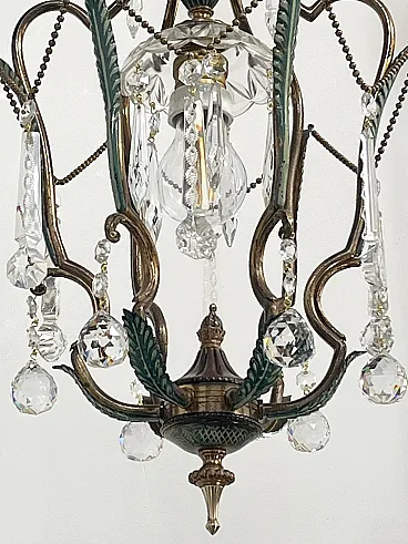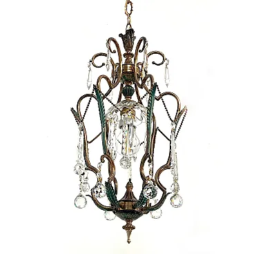 Beautiful one-light basket-shaped chandelier with enamelled brass structure. In fact, the lower part of the leaves is colored aquamarine green. The lower closing dome is also finely decorated in green. The chandelier has cut crystal drops of "Czech" origin, round faceted crystal drops and cut hands. The central bobeche is made of glass.