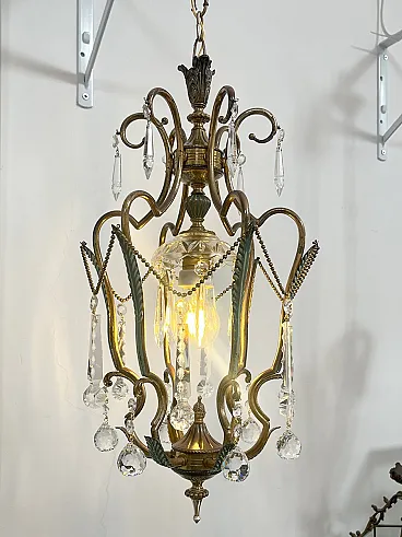 The chandelier has been completely professionally restored, ready to hang. We have been carrying out restoration of historic lights for over 15 years. It has a brass lamp holder with ceramic ring with E27 socket. All the drop hooks have been replaced with brass hooks. The structure, cleaned and rewired, was protected with a transparent acrylic to preserve its durability. The chains made of small brass spheres from which the crystal drops hang make this basket shape rather unusual. All pieces are original.