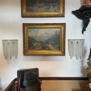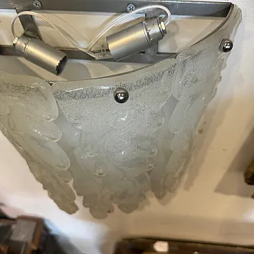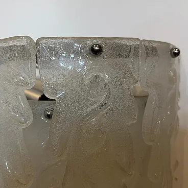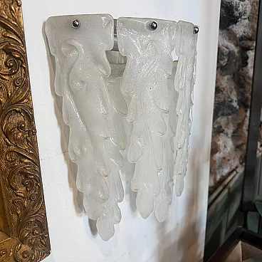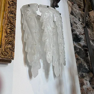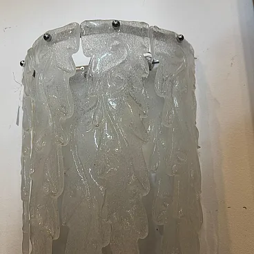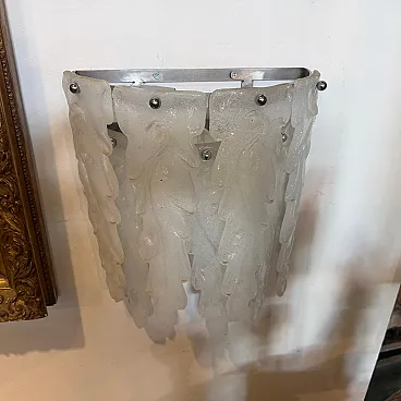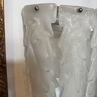 This 1970s mid-century modern wall sconce embodies the artistic elegance of Murano glassmaking, attributed to the renowned Italian manufacturer Mazzega. Each sconce features a cascading arrangement of seven heavy, hand-blown glass petals with a distinctive frosted "granilla" texture that beautifully diffuses light to create a warm, atmospheric glow. The sculptural, feather-like forms are masterfully crafted with organic curves and tapered edges, showcasing the fluid artistry characteristic of 20th-century Venetian design. These authentic vintage pieces are mounted on minimalist chrome hardware, allowing the intricate glasswork to take center stage as both a functional light source and a striking work of wall art. Both sconces remain in excellent vintage condition, preserving the high-quality craftsmanship and elegant aesthetic of the original 1970s design.