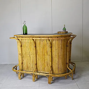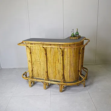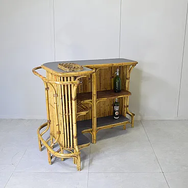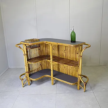 Tito Agnoli's elegant corner bar counter is crafted from solid bamboo and woven wicker. The supporting structure is made of heat-bent bamboo canes, which define the perimeter and the distinctive integrated double-band footrest. The central body is covered with a dense vertical wicker weave, a technique typical of Italian manufacturing of the period. This piece reflects Tito Agnoli's rationalist approach to organic materials. The L-shape is designed to optimize space without sacrificing surface area. The curved supporting elements demonstrate the high-quality craftsmanship typical of the high-quality production that, in the 1960s, reinterpreted colonial style with a modern, urban twist.