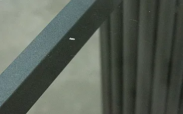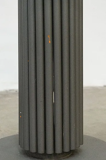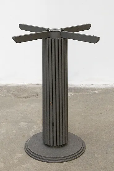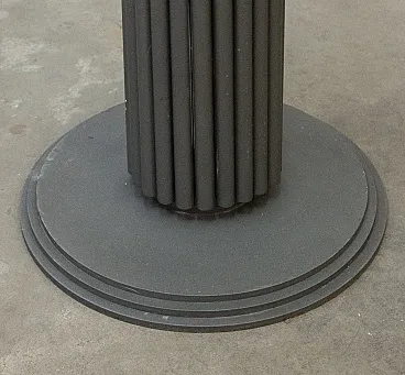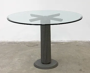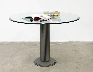 It is distinguished by its particular grooved column base in matte grey finished iron, extremely solid and stable, which supports a large transparent tempered glass top (diameter 120 cm) embellished with bevelling along the edge. Thanks to the central base and the transparency of the crystal, the table is light to the eye but very spacious: it comfortably accommodates 4-6 people without the bulk of the perimeter legs.