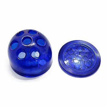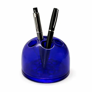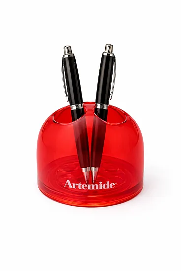 Rare and iconic set of three "Dedalino" pen holders designed by Emma Gismondi Schweinberger for Artemide. This trio features three vibrant transparent colors: Cobalt Blue, Bright Orange, and Intense Red.