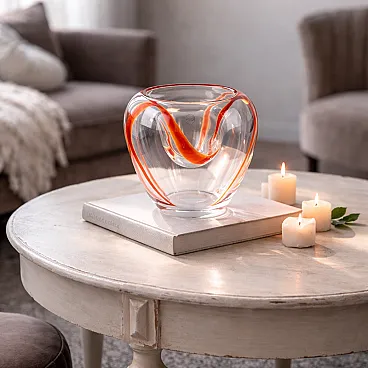 An Italian design object with a strong sculptural character, which combines the Murano tradition with a contemporary language. The transparent glass body is crossed by a fluid red glass wave, which generates depth, movement and an elegant play of light.