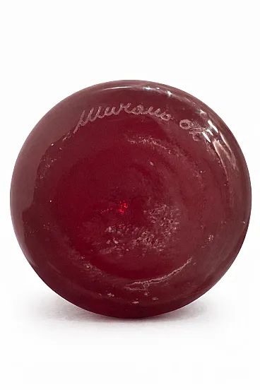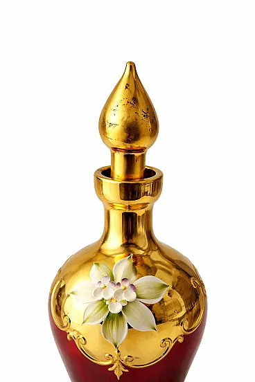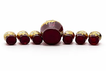 Vintage liqueur service in ruby red and gold glass, hand decorated with a floral motif in relief.