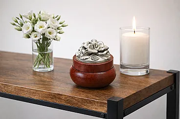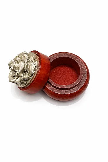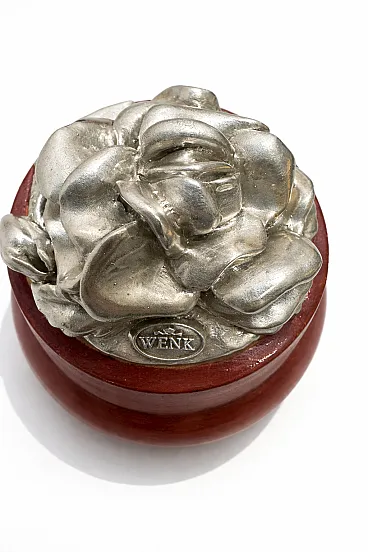 Decorative box by WENK, made of turned wood with lid covered in 800 silver finely modeled with a three-dimensional rose motif.