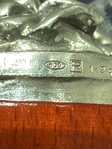The floral workmanship, sculpted with depth and precision, reflects the quality of European production in the mid-twentieth century. The contrast between the wooden base and the silver creates a refined and measured aesthetic balance.