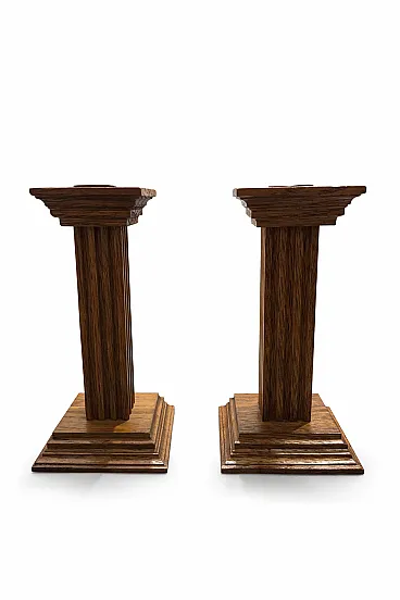 These pieces are an iconic example of the Amsterdam School style, the Dutch variant of Art Deco, known for its architectural lines and masterful use of wood. The fluted column silhouette and stepped base give a sculptural presence that combines geometric rigor and natural warmth. Unlike many similar but anonymous examples, this pair bears the original brand branded by the manufacturer on the base, guaranteeing authenticity and quality craftsmanship.