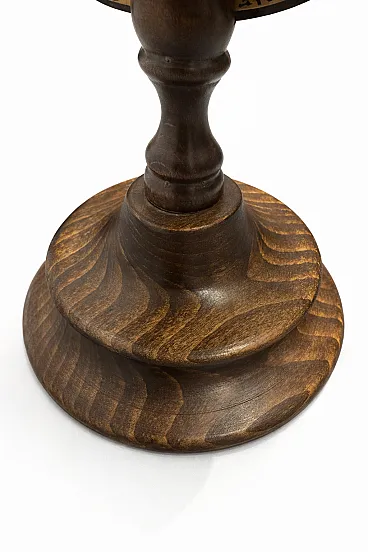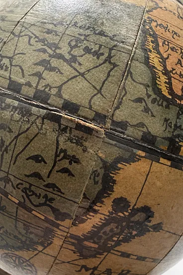 Vintage decorative globe in turned wood and bronze, covered in paper printed with reproduction of ancient cartography enriched with galleons and nautical motifs.