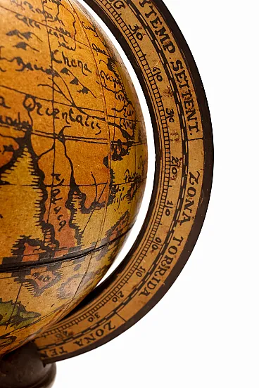 The globe rests on a turned wooden base, with a bronze finish metal meridian with geographical indications.