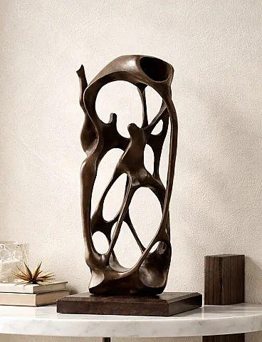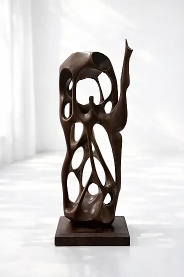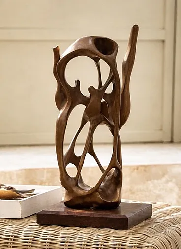 Vintage abstract wooden sculpture with a strong organic presence, inspired by modernist aesthetics.