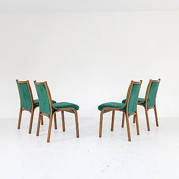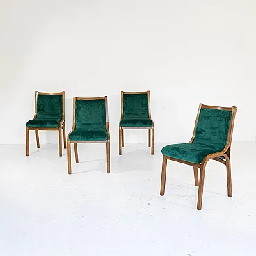 Elegant set of four model chairs “Cavour”, designed by Gregotti, Meneghetti and Stoppino for SIM, an iconic example of Italian design in the second half of the twentieth century. The structure is made of curved wood with a warm finish and clearly visible grain, while the seat and backrest are covered in deep green velvet, which gives character and refinement to the whole. The soft and continuous lines of the side uprights harmoniously accompany the padded seat, making these chairs ideal for a dining room or a representative environment with a refined taste. Measures: height: 85 cm width: 55 cm depth: 49 cm sitting height: 48 cm