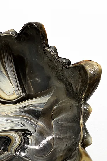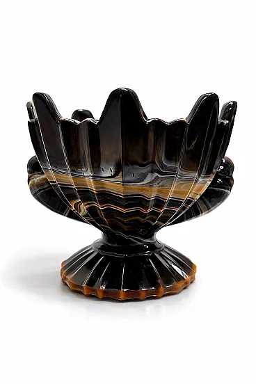 Rare example of pressed glass centerpiece produced by the Croatian manufacturer STS Abel Zagreb between the late 1920s and early 1930s. The object is distinguished by the refined technique of marbled glass (often cataloged as Lithyalin or Marmorite), with an exceptional swirl pattern in shades of black, amber and cream that imitates the veins of natural agate.
