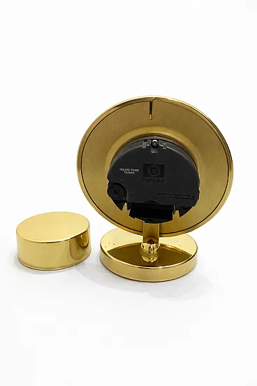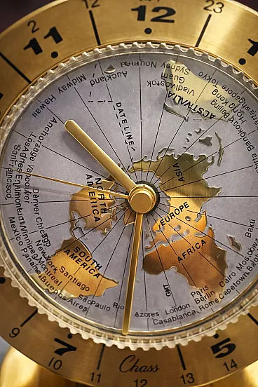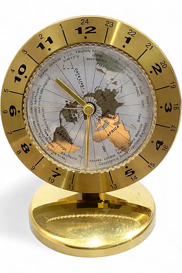 Elegant vintage brass desk clock with world map dial, capable of combining function and decorative presence in a mid-century European style.