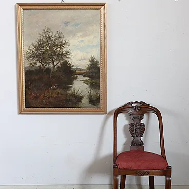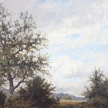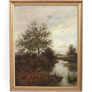 This painting is very beautiful and pleasant, with a generously sized canvas. Its vertical format creates a strong visual impact in any environment. A river landscape with lush vegetation is depicted, a serene rural scene with lush trees reflecting in the water. The small river that characterizes the landscape creates a pleasant perspective that guides the viewer towards the rolling hills in the background. The sky, with delicate gray clouds covering the blue, harmoniously concludes the work. On the left, the figure of a fisherman adds vitality to the scene. The pictorial quality is very high, demonstrating the artist's great skill in depicting nature in detail, while adding a romantic charm. This painting will transport you to the peace and serenity of an English river landscape.