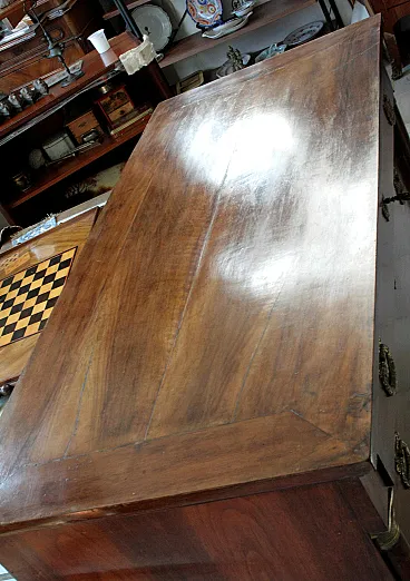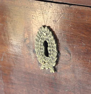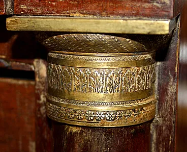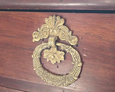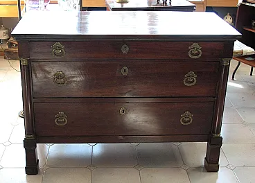 The Empire chest of drawers in walnut with bronze details dates from the 19th century and is an authentic example of period Italian craftsmanship. Made of fine walnut wood, it features fine bronze details that enrich its structure, giving it a timeless elegance. Black ebonized wood side columns create a sophisticated contrast and further enhance the classic design. This piece of furniture is perfectly suited to fine residences, living rooms or master bedrooms, offering not only practical functionality thanks to its large drawers, but also important aesthetic value. Its small size makes it versatile, measuring 57 cm wide, 125 cm long and 90 cm high, ideal for spaces that require a touch of history and sophistication.