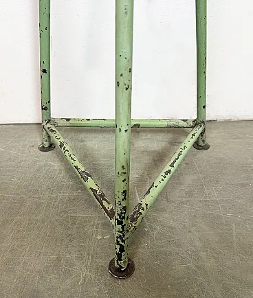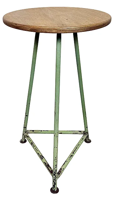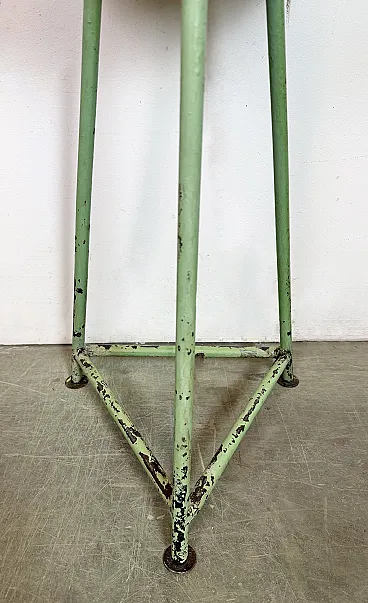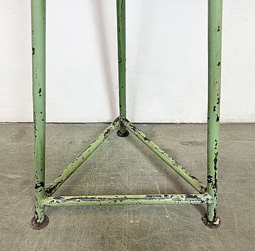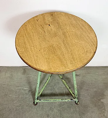Vintage Industrial factory stool made in former Czechoslovakia during the 1960s It features a plywood seat and a green iron frame. The weight of the stool is 5 kg. The diameter of the seat is 35 cm.