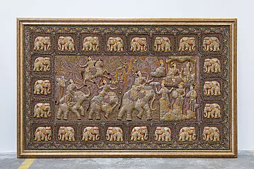 Kalaga has its roots in Burmese court art, particularly from the Konbaung dynasty (19th century), where it was used for the decoration of fine interiors, such as palaces and monasteries. The combined use of different textile techniques gives the Kalaga a distinctive appearance. In particular the Relief technique: The main figures, including the elephants and riders, were padded and sewn in appliqué to create a marked three-dimensional effect on the surface of the base fabric