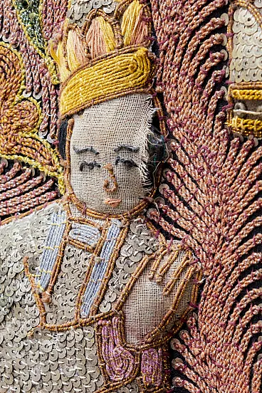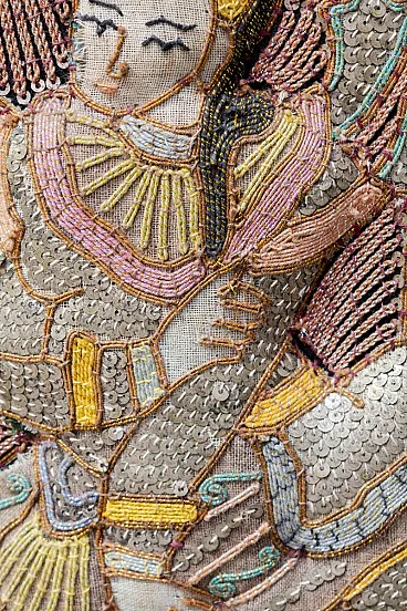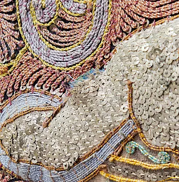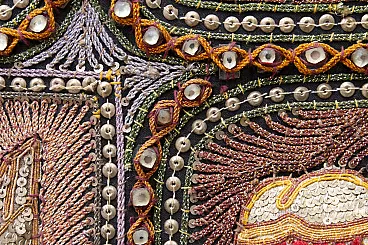 The large artefact (231 cm x 148 cm) features a rich manual workmanship of embroidery and appliqué, beads, sequins and fabric cords, typical of this artisanal tradition