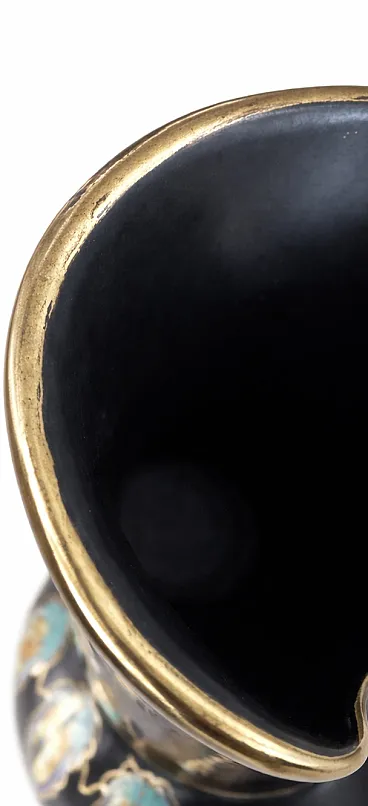 This elegant vintage object features the typical matte black glaze with hand-painted floral decoration and gold details, characteristic of Dutch Gouda artistic pottery.