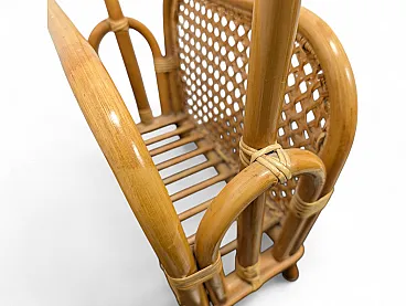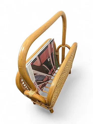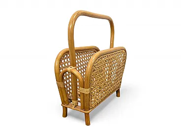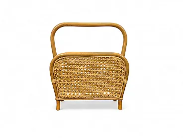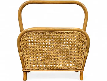 Elegant and functional, this vintage midcentury-style magazine rack is handcrafted from honey-toned wicker and bamboo. The structure stands out for its sinuous and organic lines, with a large upper handle that facilitates movement and finely crafted side panels with a decorative mesh weave. The base is raised on four sturdy feet, while the slatted bottom ensures solidity and stability to accommodate magazines and books. A versatile and timeless piece of furniture, perfect for adding a touch of natural warmth and retro charm to any corner of the home.
