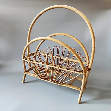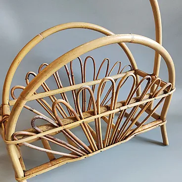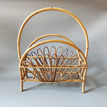 Iconic piece of Italian Mid-Century Modern design by the legendary Franco Albini, this 1960s magazine rack is a masterclass in organic geometry and artisanal craftsmanship. Crafted in Italy, it perfectly captures the sophisticated "tiki-chic" aesthetic that remains highly coveted by interior designers today. This piece features a striking triple-arch silhouette, providing both functional organization and a rhythmic visual appeal. The central basket is adorned with delicate, hand-bent rattan "petals" or loops, creating a fan-like effect that feels light and airy. The warm, honey-toned patina of the bamboo adds a natural, grounding element to any room, from a sun-drenched minimalist living space to a curated eclectic library. It's in excellent condition. Made in Italy.