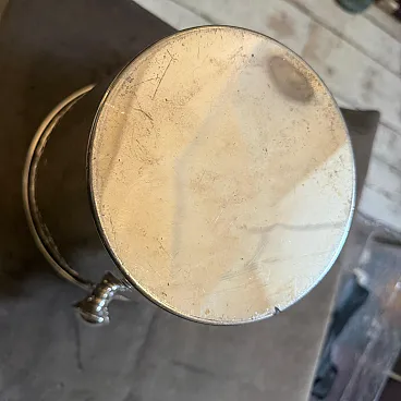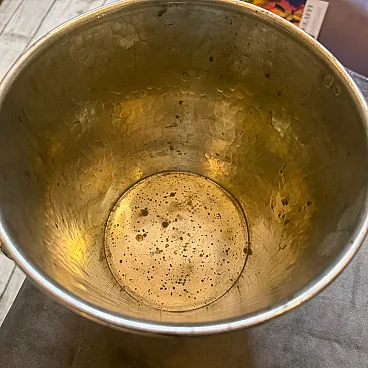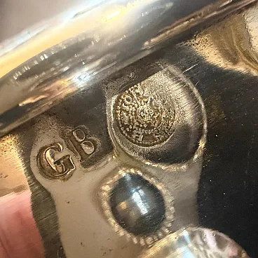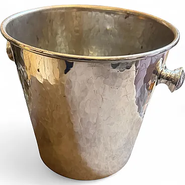 Elevate your barware collection with this sophisticated 1970s Italian wine cooler, a quintessential example of Mid-Century Modern design. This vintage piece is crafted from high-quality silver-plated metal and features a stunning hand-hammered texture that creates a rhythmic, light-catching surface across the entire body. The tapered silhouette is anchored by two classic knob-style handles, blending functional utility with an understated, sculptural elegance. Authenticity is confirmed by the markings on the underside, which include the "GB" maker's mark and an official Italian hallmark, signifying its origin and craftsmanship. The cooler has a wonderful weight and a brilliant luster that has aged gracefully over the decades. It is in excellent vintage condition with a light, natural patina that only adds to its character, though it can be polished to a mirror shine if preferred. Whether used for chilling a fine bottle of champagne or displayed as a standalone decorative object, this piece brings a touch of timeless Milanese glamour to any contemporary home. It's in good vintage condition.