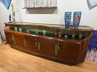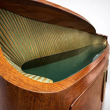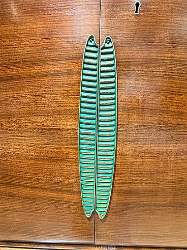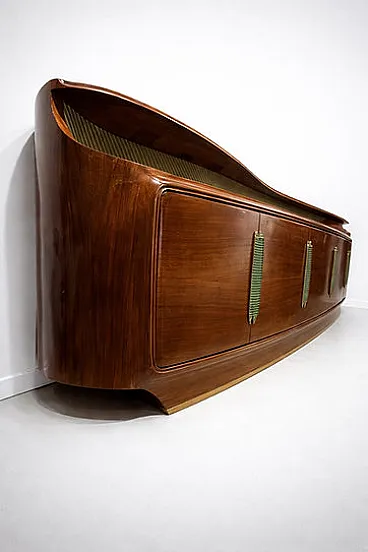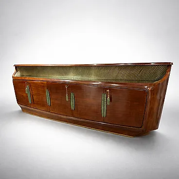Italian sideboard with 5 doors, rounded and softened lines; the curved ends and the overall aerodynamic but voluminous shape, with "cascade" edges, are hallmarks of the Art Deco style of the 1930s and 1940s in Italy. Luxury materials and finishes, rich rosewood veneer symbolizes the luxury and refinement of the Deco movement. The brass/metal details, the striking stylized vertical handles (reminiscent of palm or banana leaves, a stylized botanical motif common in Art Deco), the horizontal brass finishes along the base, the recessed under-plane band features a grooved texture dyed in the light green tone and finished in a gold hue, creating a strong geometric and material contrast.
