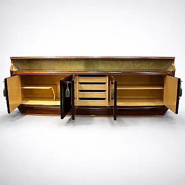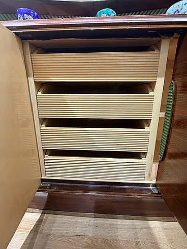 The interior structure shows a combination of shelf spaces and a central row of wooden drawers, which is a standard and practical arrangement for a dining room sideboard. The style perfectly captures the transition between the glamour of Art Deco and the desire for more elegant forms, which leads to the post-war Mid-Century. The sideboard represents a form of craftsmanship celebrated in Italian design in the 1940s, featuring several characteristics typical of late Italian Art Deco, which often bridged the gap between the opulent Art Deco of the 1920s and 1930s and the cleaner lines of Mid-Century Modern.