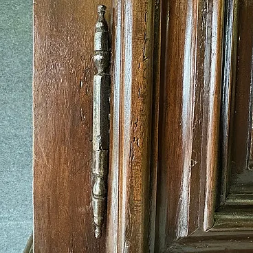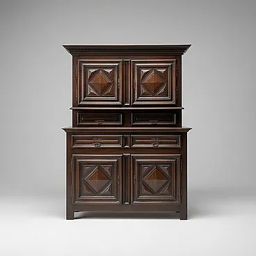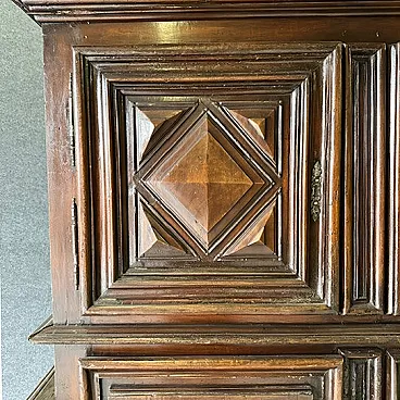 The cabinet is composed of a lower part with doors and drawers and an upper lift with doors, according to a functional typology widespread between the 17th and 18th centuries. The doors are decorated with panels carved in a geometric diamond-point pattern, a distinctive element that gives depth and play of light to the surface.